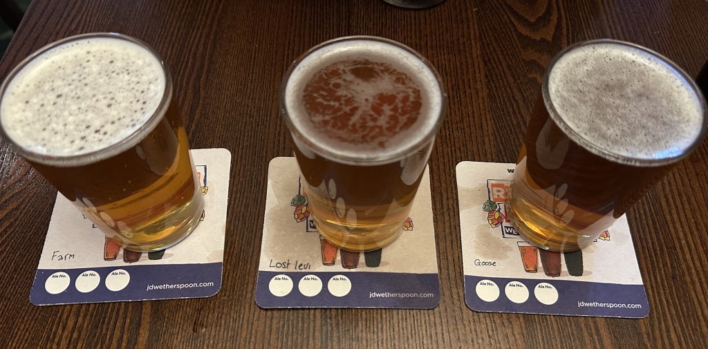 Wetherspoon is once again promoting its third-pint measures, allowing you to sample three ales for the price of a pint. This is brilliant for a festival like this, making it easy to sample a range of new and often unique ales without committing to a half or full pint (or getting too drunk!). These are available on the app too, and the staff were kind enough to label the beers before they brought them to us!