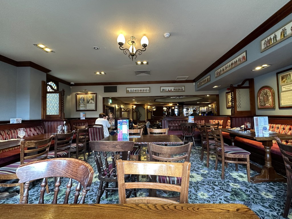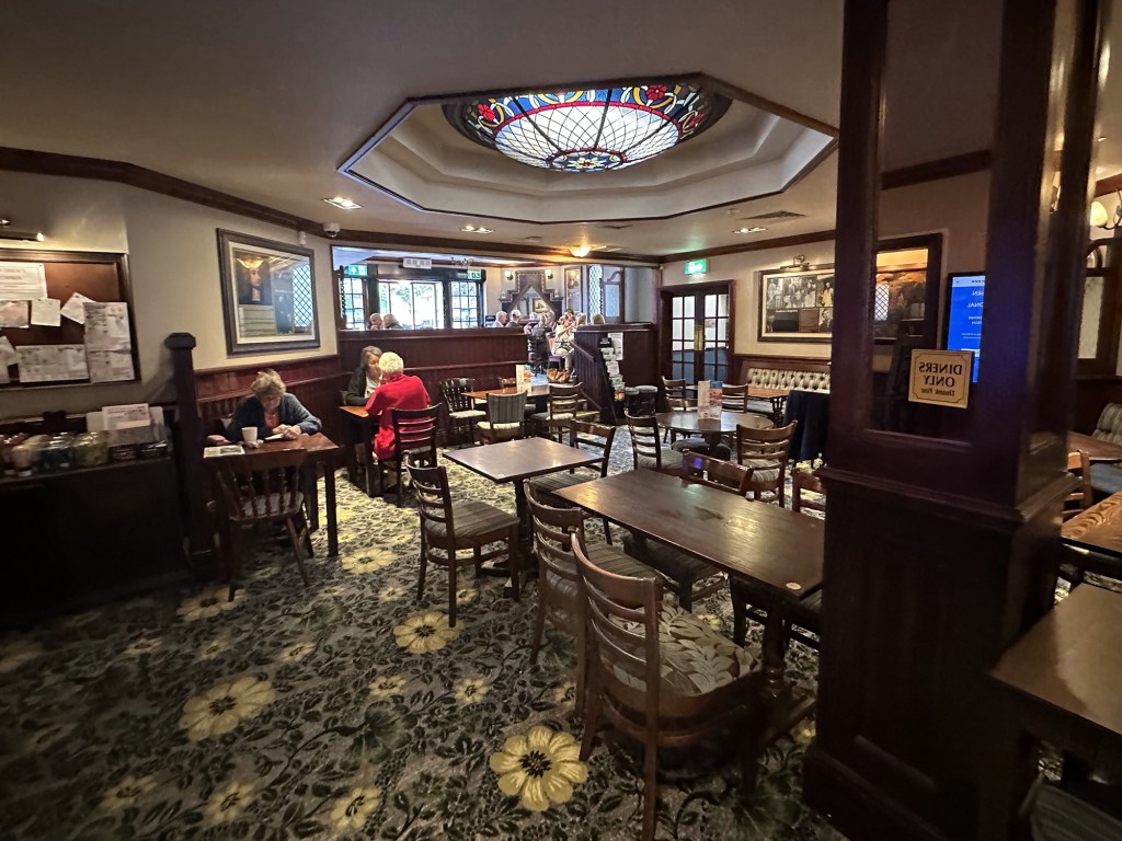 The interior of the pub is interestingly themed, harking back to the times of its namesake with stained glass separating the booths and small tapestries adorning the walls. It underwent a renovation in 2015 and whilst the neutral theming still feels fresh, the furnishings are beginning to feel dated. At the front it has a spacious bar area flanked by a raised seating area, with another to the rear, and with a few tables at the front of the pub. An application to the council to turn the rear car park into a beer garden was refused in 2018 which is unfortunate as this could’ve been a wonderful addition to the pub.