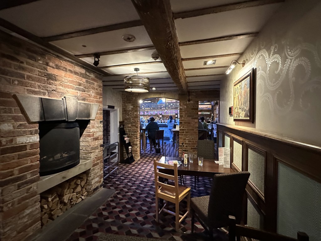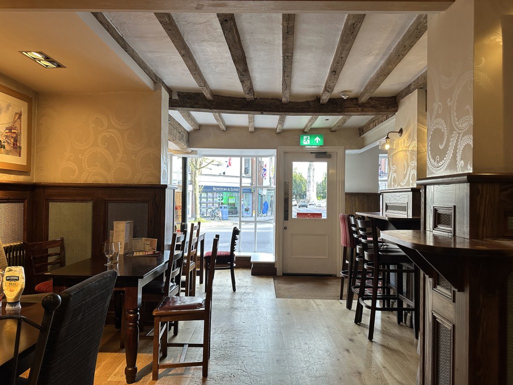 Inside the pub is a wonderful mixture of traditional and contemporary, with cosy, secluded areas showcasing and a brick-enclosed fireplace. In the more historic end of the pub, facing out onto Market Street, the seating areas feature exposed wooden beams and dark wood panelling on the walls.