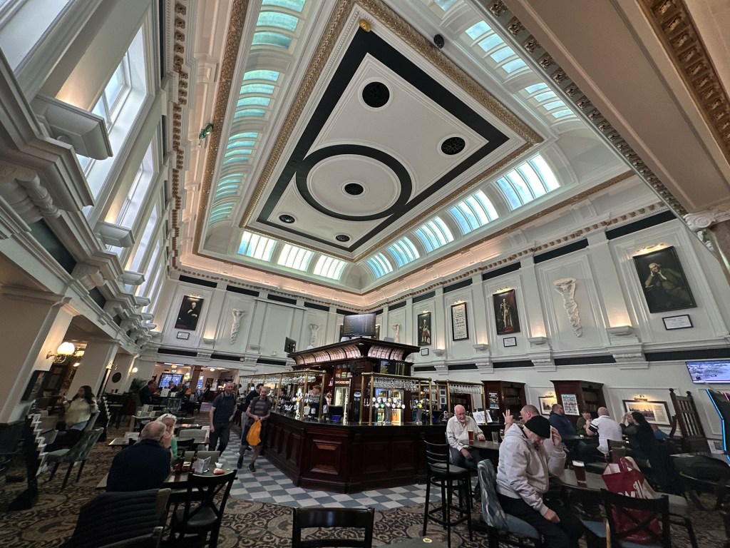 The pub underwent a magnificent £1.7m refurbishment in 2022. Tall marble pillars welcome you into the main bar area which hosts a large central bar under a high, elaborate ceiling bordered by curved skylights. The interior continues its Italian-inspired design with decorative pilasters and moulding drawing attention to the large sculptures and portraits hanging above.
