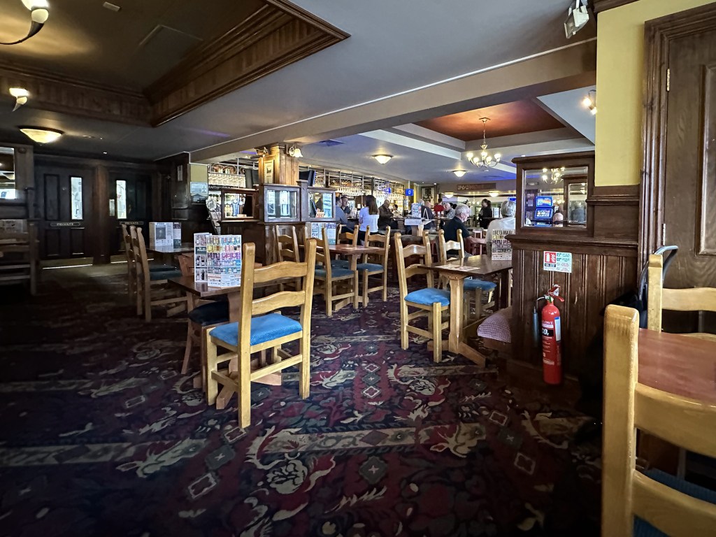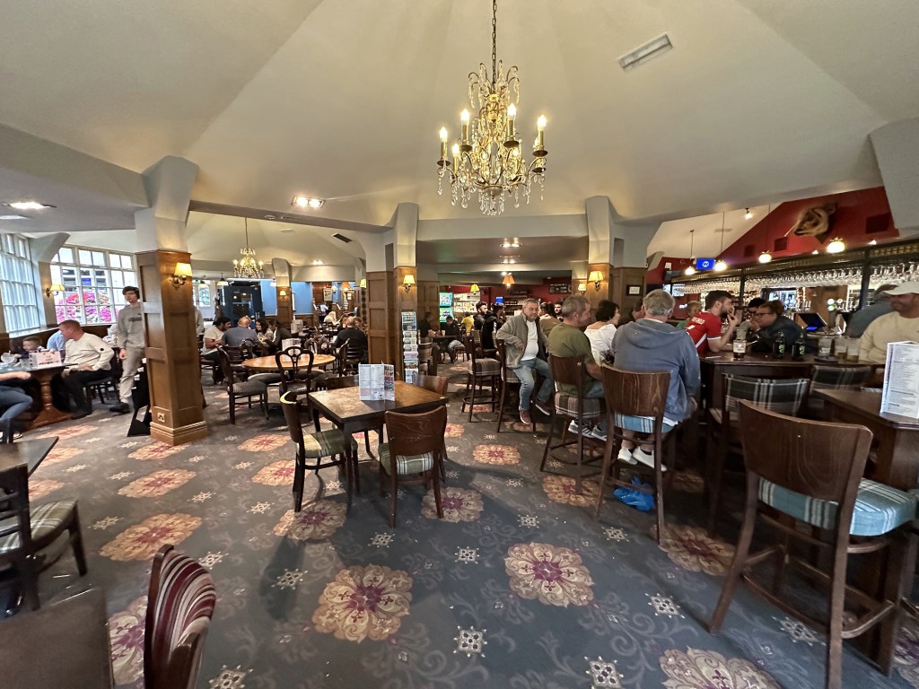 Inside the pub is large and its open plan layout offers plenty of seating, with a ground floor wrapped around the central bar and an upstairs mezzanine area, which was unfortunately closed when we arrived on a quiet day. The pub feels reasonably fresh following its £719,000 refurbishment in 2022, although the colour theme felt overwhelmingly brown in our opinion. The carpet, however, was a wonderful feature, encompassing the cinquefoil of Leicestershire and incorporating a corn motif in keeping with the building’s history.